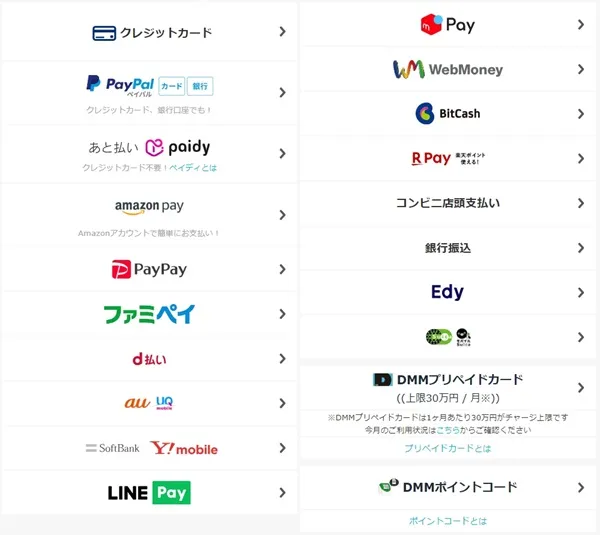 各種クレジットカード、PayPal、あと払いpaidy、AmazonPay、PayPay、ファミペイ、d払い、au UQ、softbank Y!mobile、LINE Pay、メルカリPay、WebMoney、BitCash、R楽天Pay、コンビニ店頭支払い、銀行振込み、Edy、Suica、DMMプリペイドカード、DMMポイントコード
