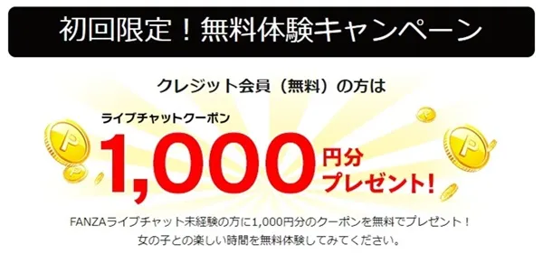 FANZAライブチャットに無料のクレジットカード会員としてアカウント新規登録サインアップ後に、FANZAライブチャットでつかえる1000円分のライブチャットクーポンを無料でプレゼントいたします。