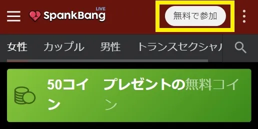 SpankbangLVIE:スパンクバンライブ の海外エロチャット配信アプリでは、まだログインしていない状態だと「無料で参加」のボタンが画面内に表示されています。