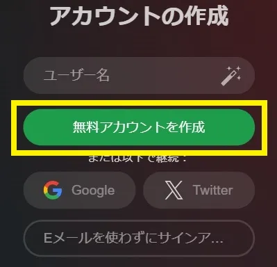 - 手順4.「ユーザー名」「Eメールアドレス」を入力し「無料アカウントを作成」ボタンを押しましょう